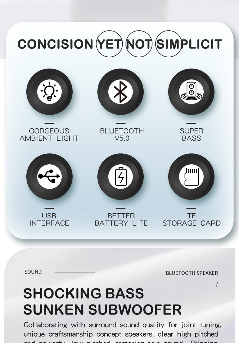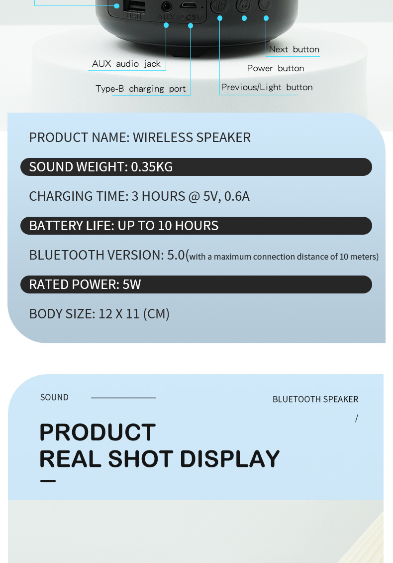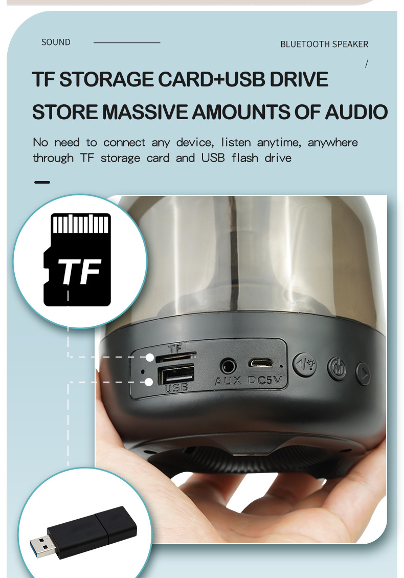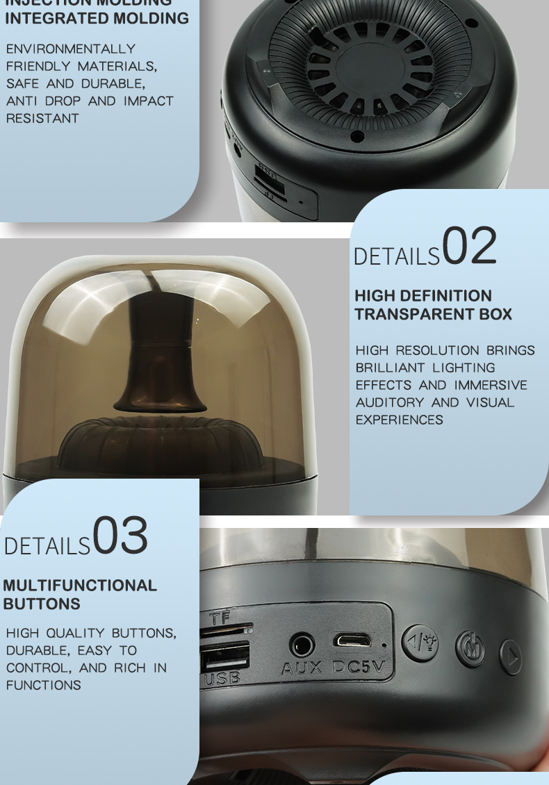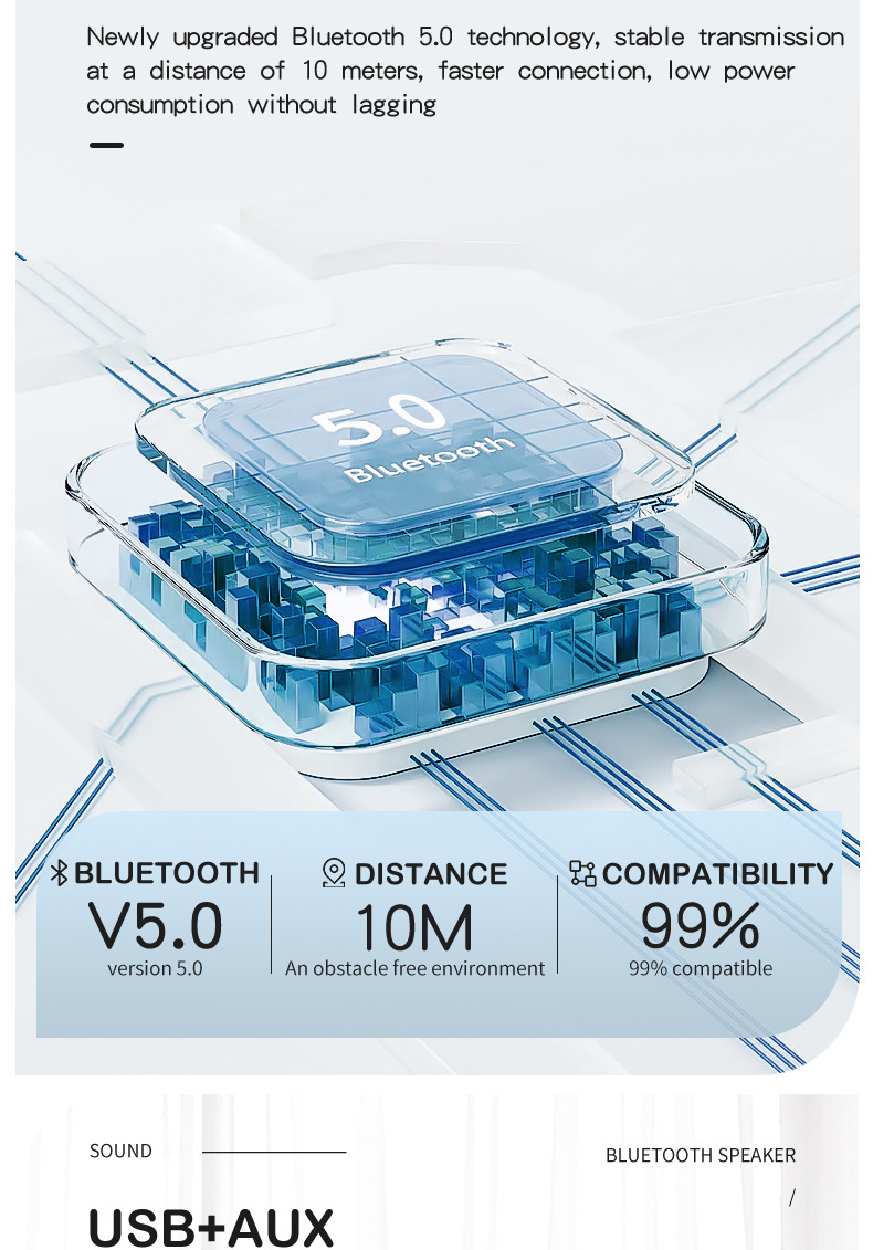 5. ការភ្ជាប់ច្រើនរបៀប: រីករាយជាមួយជម្រើសភ្ជាប់ជាច្រើនរួមមាន Bluetooth, AUX, កាត TF, និង USB ដែលត្រូវគ្នា។